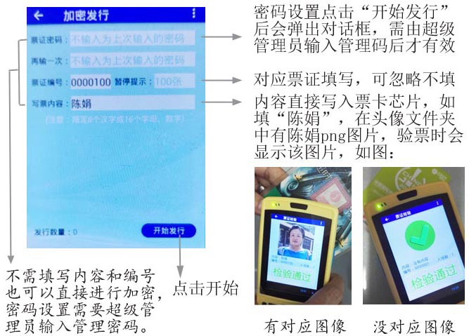 設置票證密碼、填寫內容,然后將密碼內容寫到票證芯片,檢驗時密碼對應則有效,同時將檢驗標記寫到票證芯片;如內容對應有圖像則會實時顯示該圖像;檢驗數據、發行數據等都可以通過電腦導出,做成發行檢驗報表。